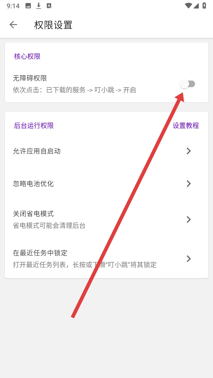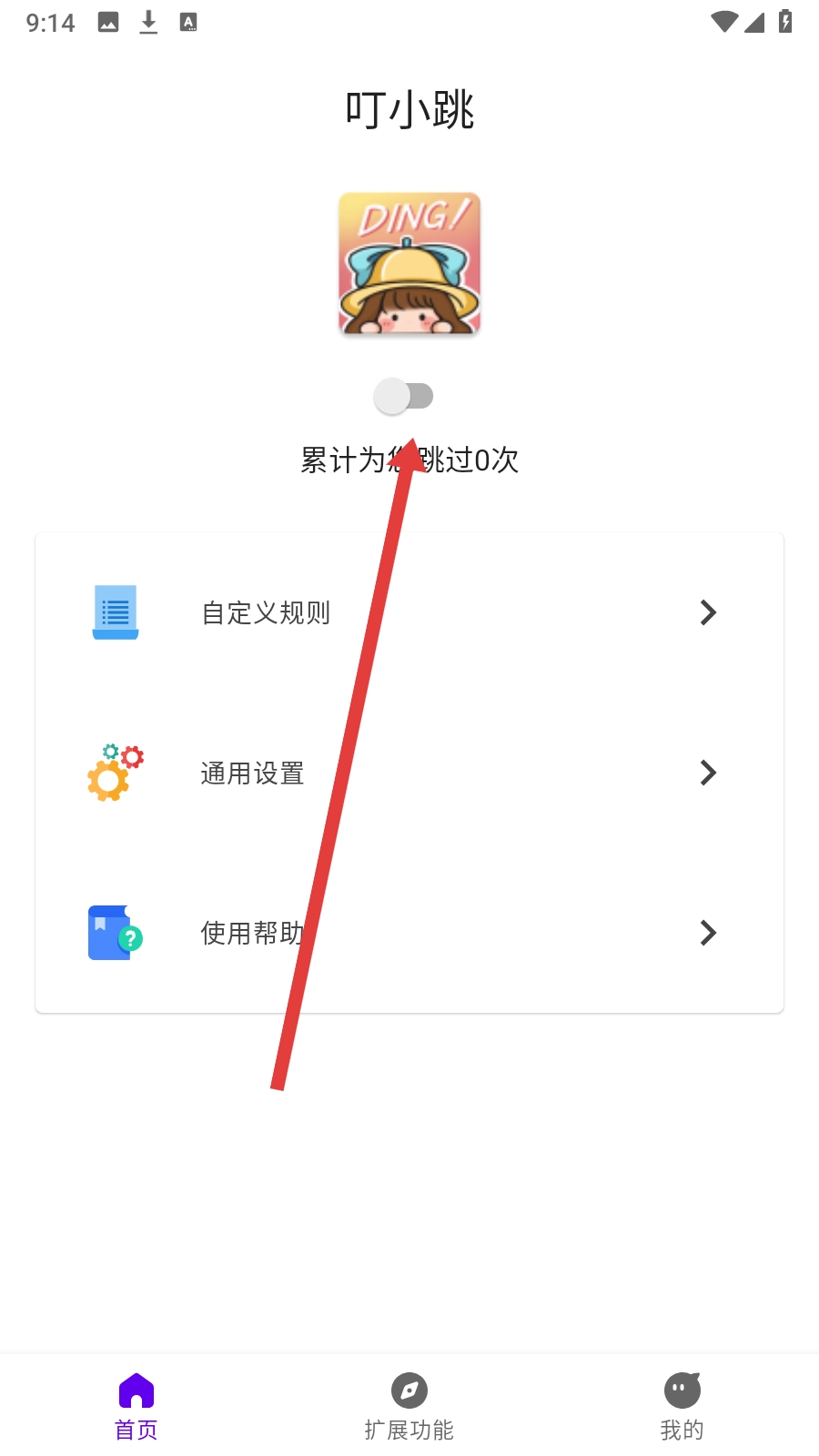 1、在首页点击【叮小跳开关】,进入权限设置页面。