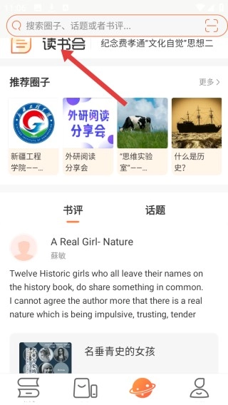 3、在读书会板块,搜索栏能够查找圈子、话题以及书评。于读书会标题下方,设有外研阅读分享会等推荐圈子,同时还有书评、话题分区。