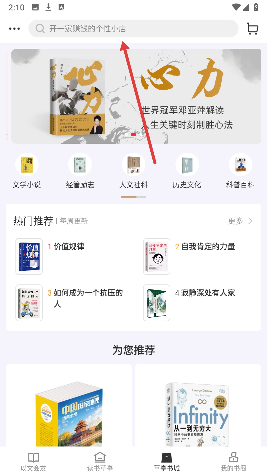 1、点击底部【草亭书城】,进入书城选书界面。