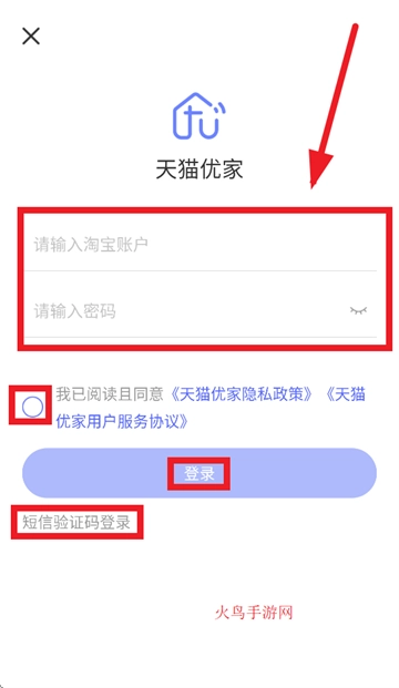 跳转到登录界面后,填入淘宝账户、密码,勾选“我已阅读且同意《天猫优家隐私政策》《天猫优家用户服务协议》”,然后点击登录就行。