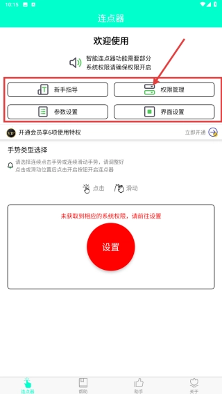 1、打开连点器,在首页点击权限管理,按指引开启对应系统权限,确保功能可用。