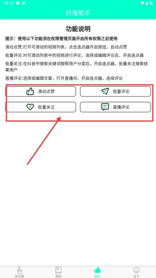 2、进入抖音助手界面,利用滑动点赞、批量评论等功能,结合连点器,高效操作抖音互动。