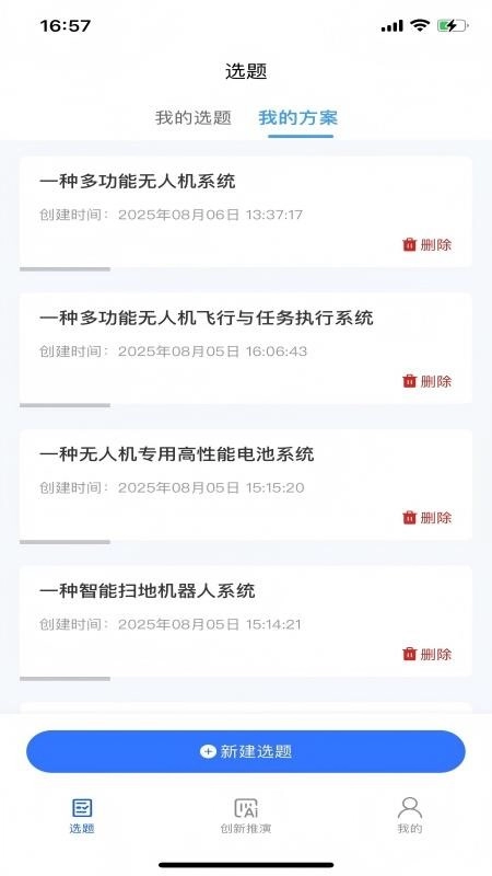 2、进入应用就能一键新建选题,并能全面管理自己的选题和方案;