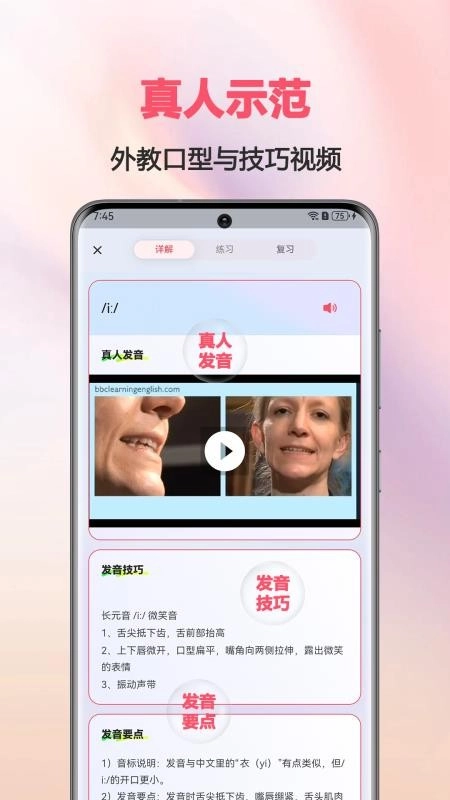 还提供了真人演示发音视频,让你可以掌握不同音标的发音口型;