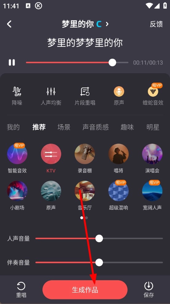 3、演唱完毕后,点击生成作品,就能完成歌曲录制。
