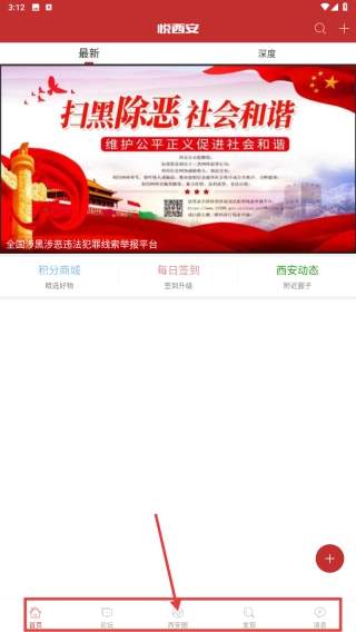 1、打开悦西安应用,点击底部西安圈子选项,进入圈子页面。