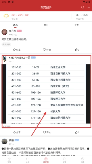 2、在西安圈子动态中,找到KINGPOWER上林苑分享的世界大学学术排名内容,查看院校排名。