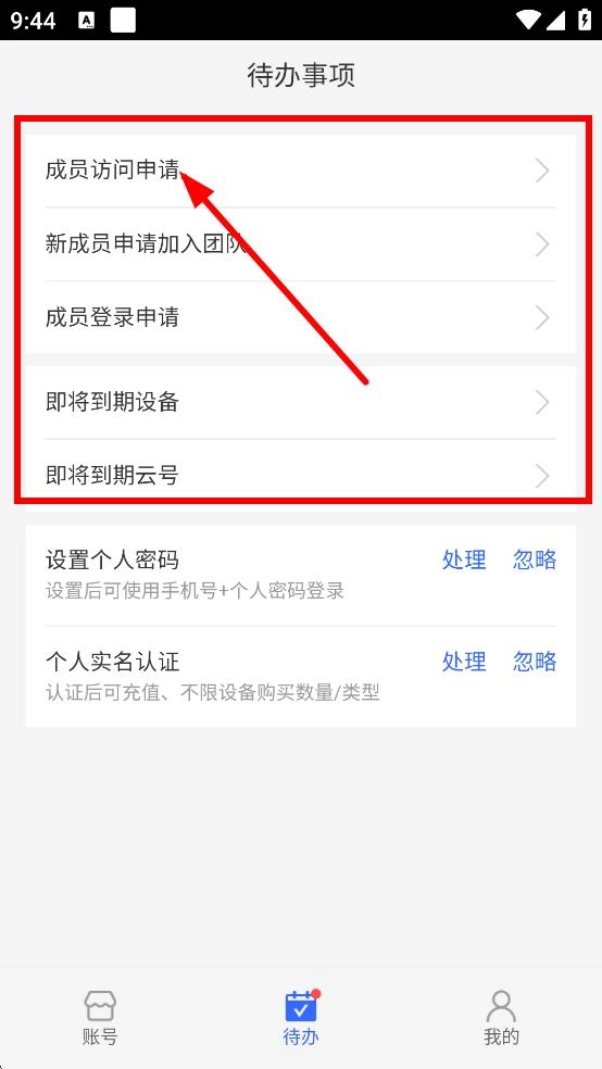 1、在待办的页面,可查看成员访问申请,新成员申请加入团队等待办事项,点击对应事项可进行处理。