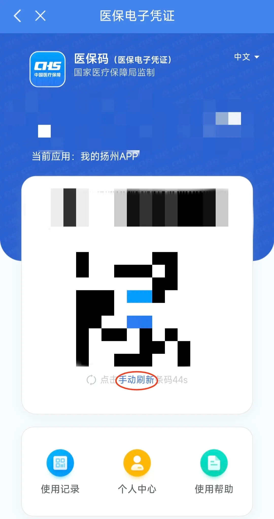 6. 最后就能看到电子医保码啦,每次截图之前,记得点击【手动刷新】,以保证医保码是最新的。