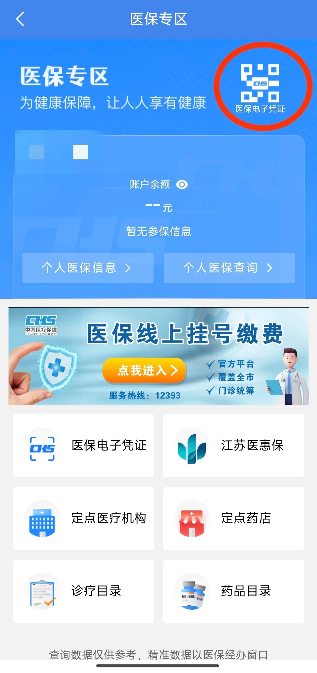 3. 登录后点击主页的【医保专区】按钮