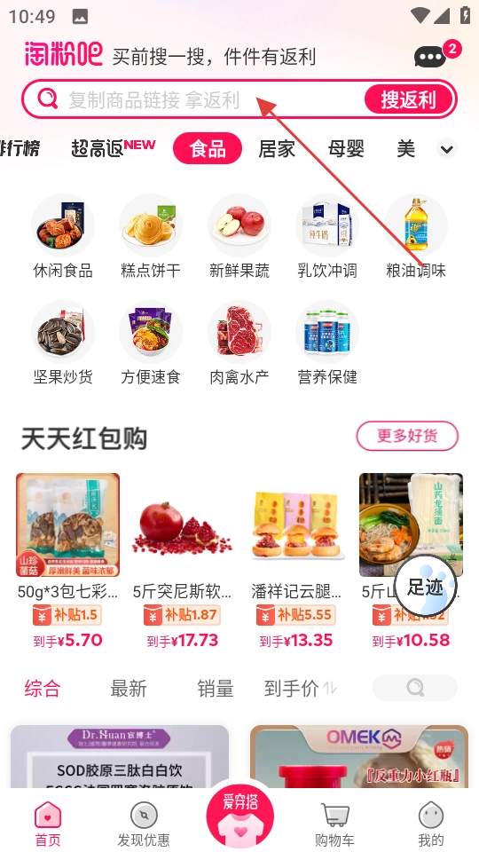 1、在首页搜索框,粘贴商品链接点搜返利。