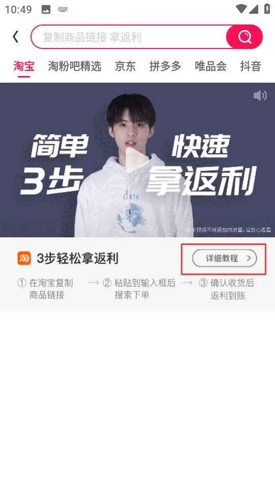 2、在搜索结果页,点击详细教程了解返利步骤。