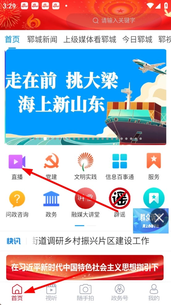 1、打开郓城融媒应用,在首页或底部功能栏中,寻找标注直播的板块,点击进入相关功能区域。