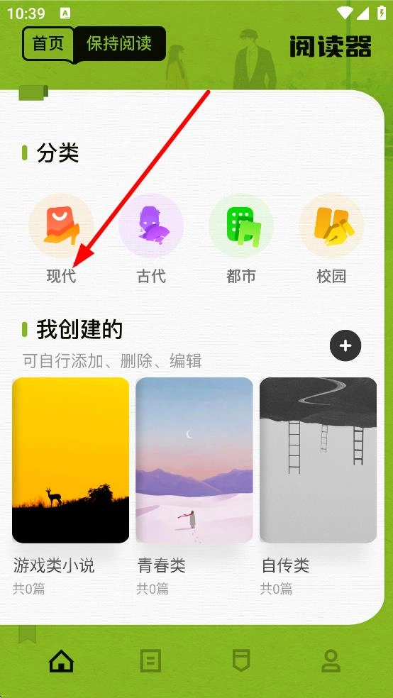 2、在现代分类页面,点击添加,进入添加小说页面。