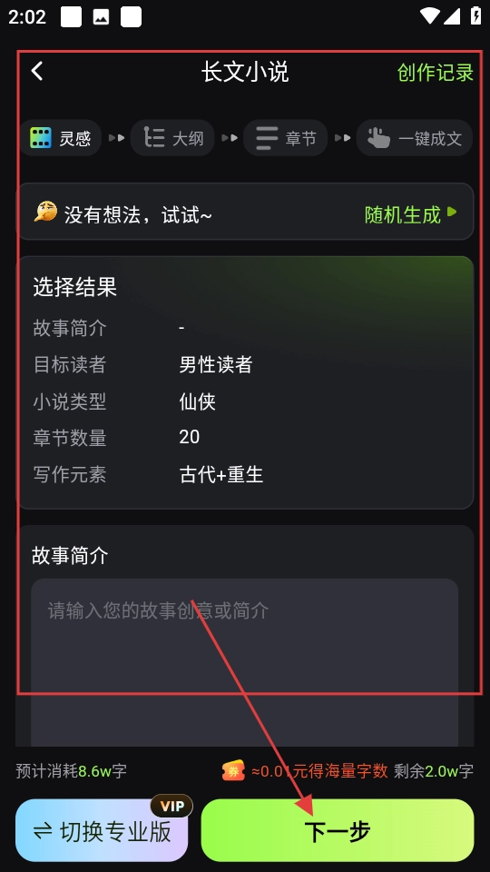1. 灵感转化流程:打开首页的创作界面,填入小说类型、目标读者、故事风格、章节数量等相关信息,接着点击“生成灵感”按钮,即可得到完整的故事简介及大纲框架。