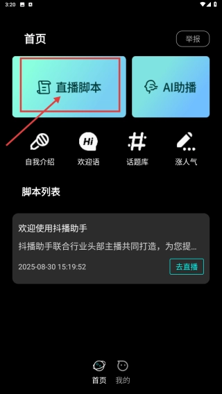 1、打开抖音助手应用,点击直播脚本选项,进入创建脚本页面。