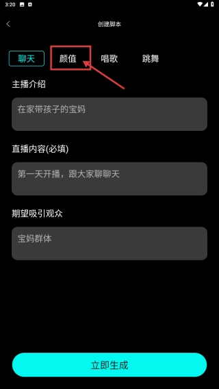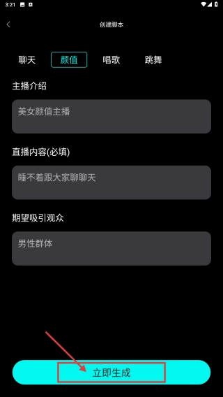 3、信息填写完成后,点击立即生成按钮,生成颜值类直播脚本。