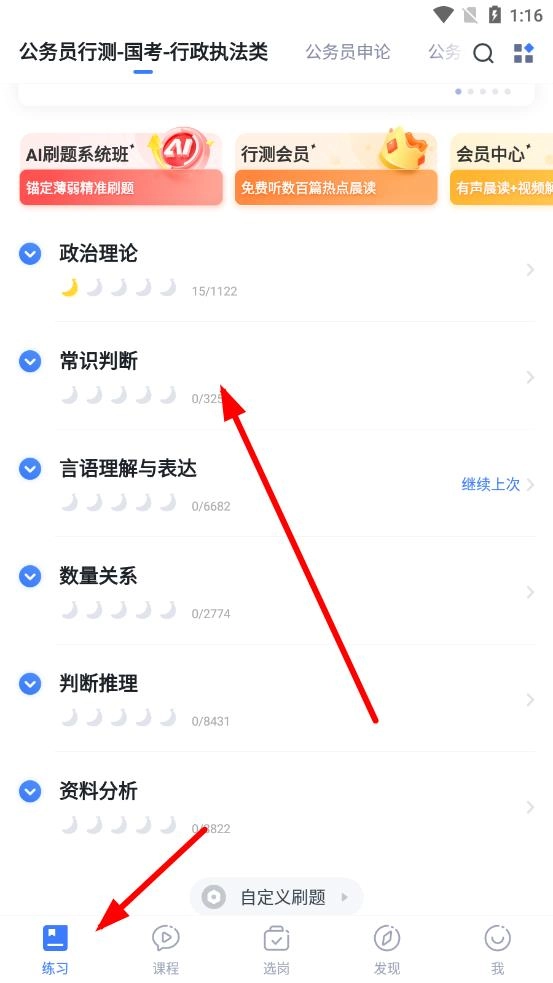 1、打开粉笔,点击底部导航栏练习选项,进入练习板块,从中挑选需添加笔记题目的对应科目。