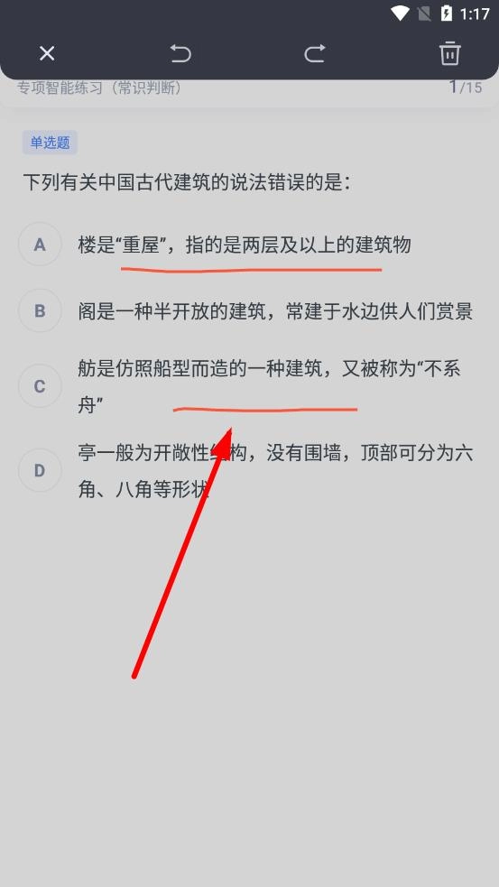 2、进入具体科目练习页面答题,遇到需记录重点或疑问的题目,点击题目上方笔记便签样式的图标。