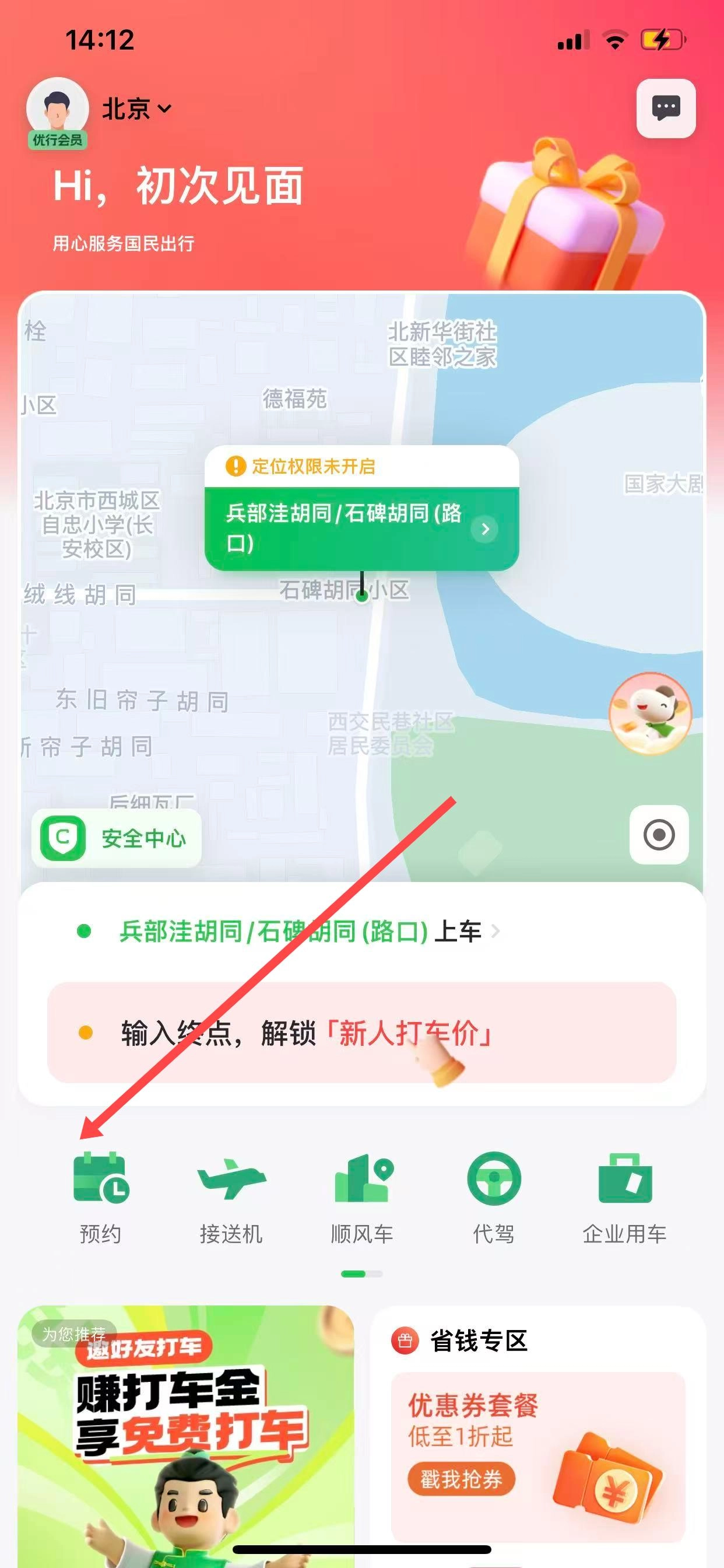 1、打开曹操出行App,进入主界面后,找到并点击预约选项,进入预约用车页面。