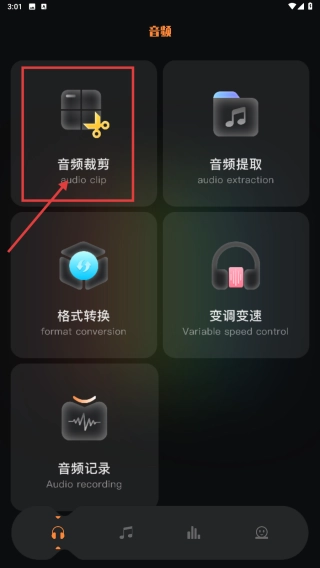 1、打开音频编辑应用,点击音频裁剪选项,进入选择音频界面。