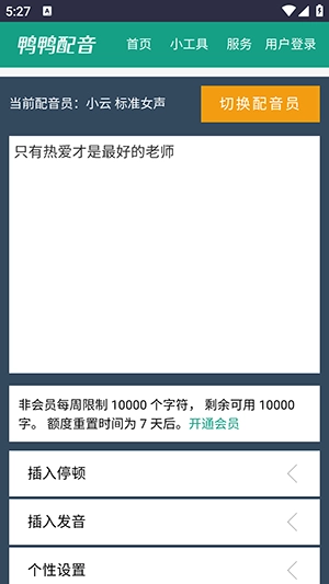 1、我们给予多达10,000字的免费配音尝试机会,使每一位用户都可轻松领略专业配音的魅力。