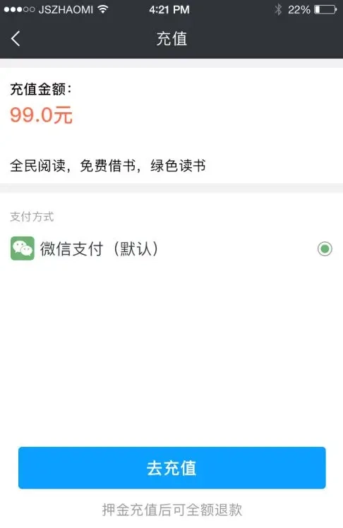2:在押金充值页面,点击“去充值”,完成支付