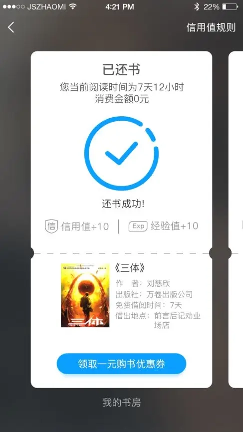 4. 可在个人中心的“我的”—“我的借阅”里查看还书状态。