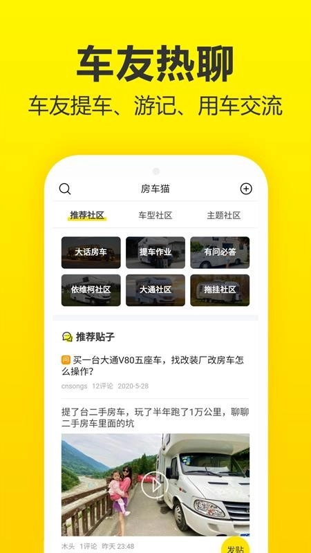 1. 房车社区,在这里,不仅可以分享房车相关内容,还能与大家一同探讨交流,而且在购买房车前,你还能听取到真实可靠的意见。