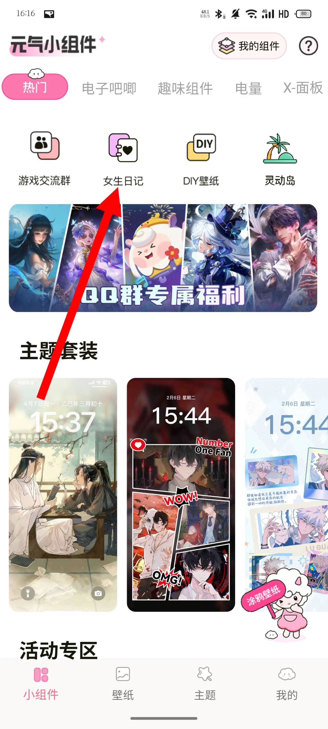 1、打开,在首页点击女生日记选项,进入女生日记相关功能页面。