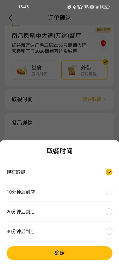 4、订单页面的正上方设有两项功能,用户既能够选择前往店面就餐,也可以选择自行到店面取餐,完成选择后点击取餐时间。
