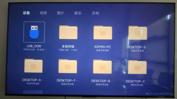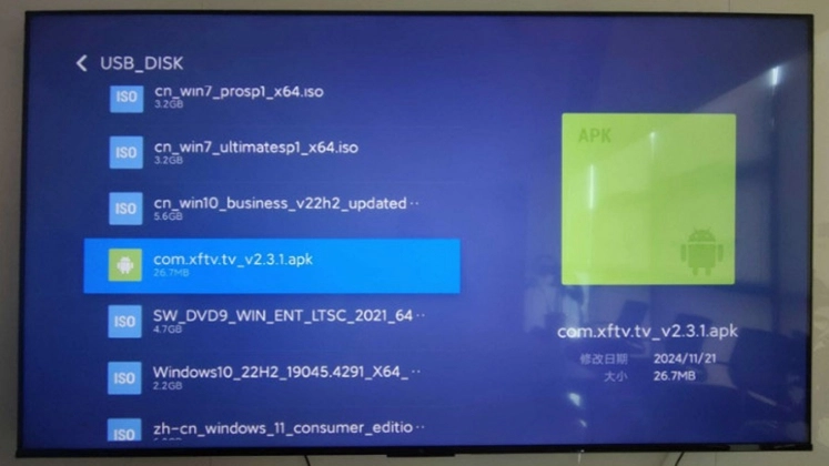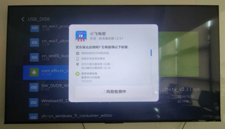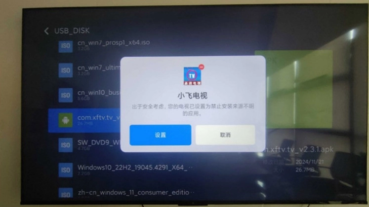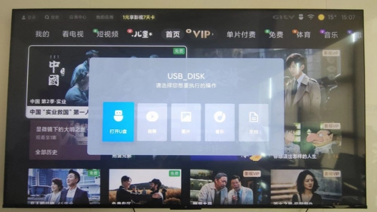2、把存有优质小飞电视安装包的U盘,插入电视的USB接口,此时电视会提示检测到新的USB设备并询问是否打开。