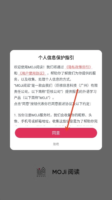 1、安装本站的MOJi阅读,打开软件,同意协议并继续操作