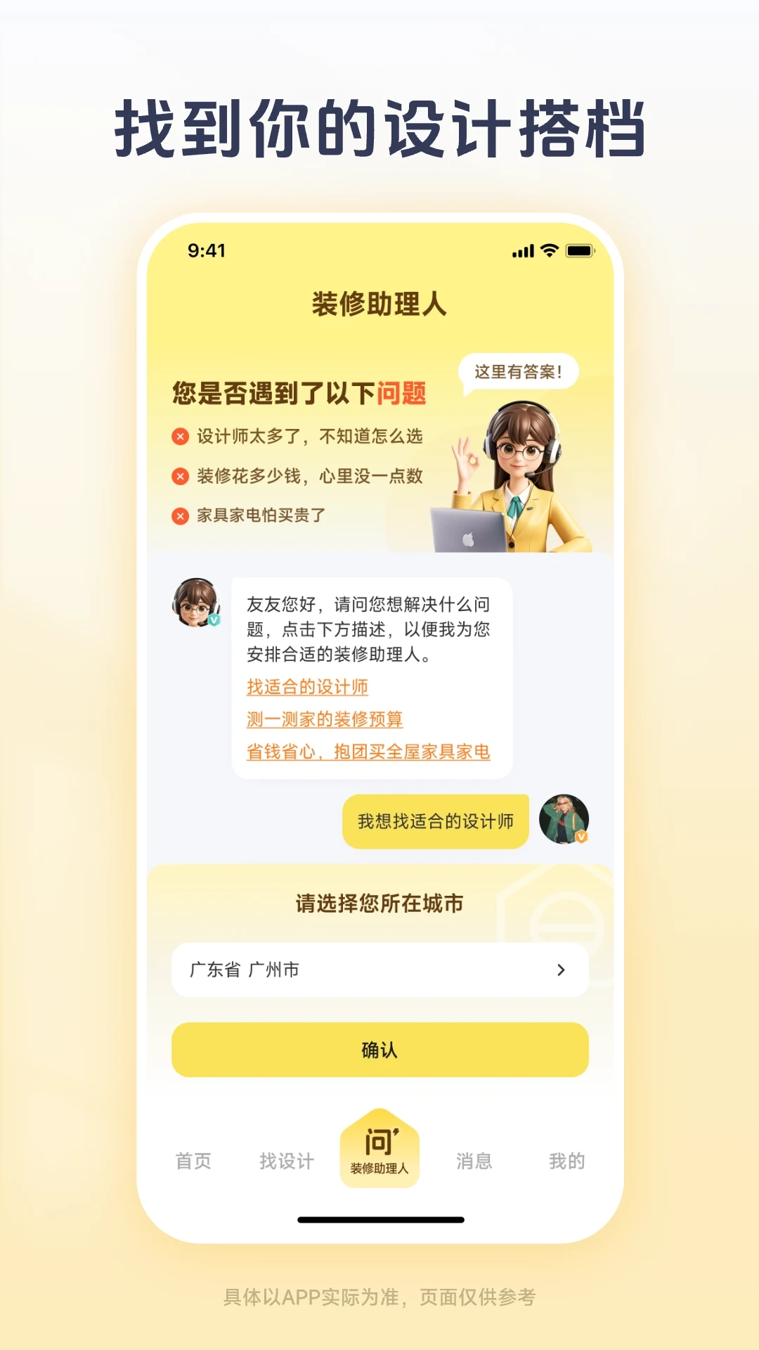 3、设计师服务入口:可按地区筛选专业设计师,实现一对一沟通,定制专属装修方案。