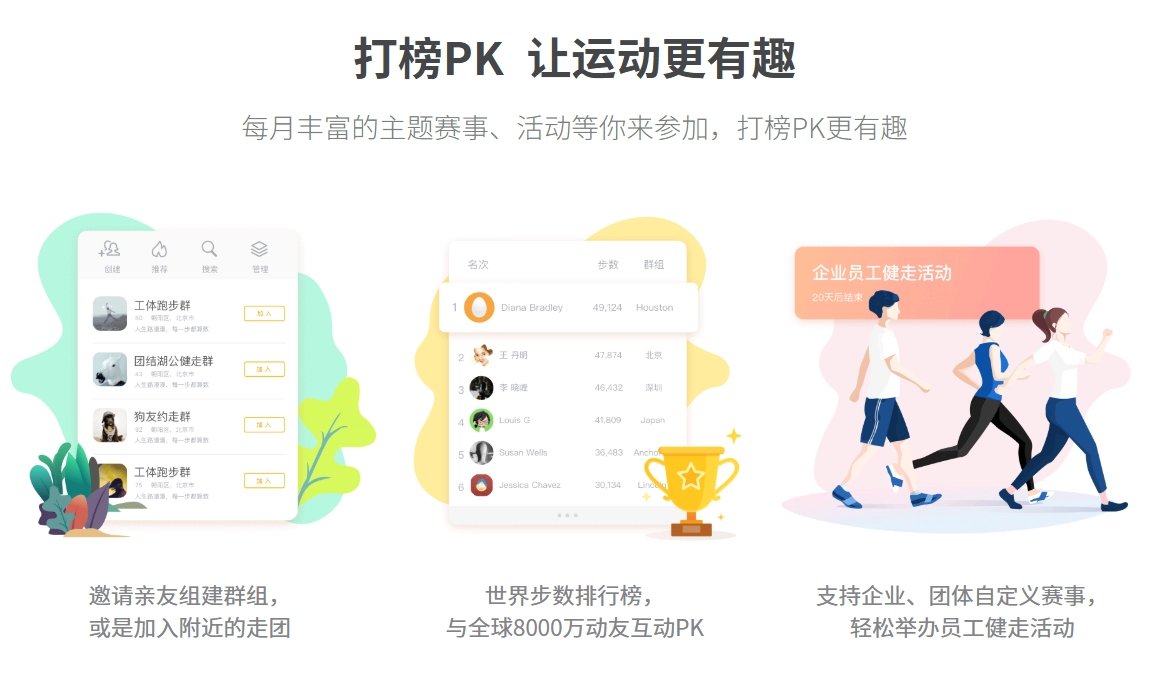 -举办全球挑战赛、步数竞赛、里程排行等活动。
