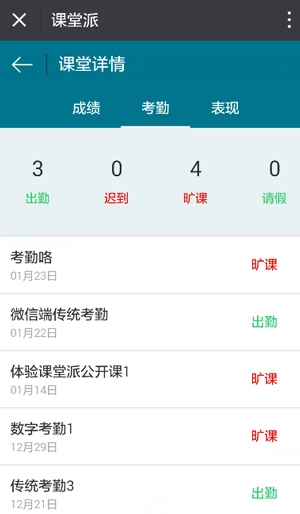 2、于考勤模块内,能够查看每一次的考勤记录,并对学生的出勤、迟到、旷课以及请假状况进行统计。