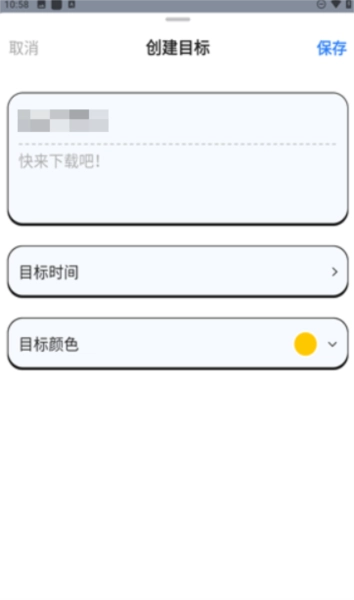4、用户可自行填写想要创建目标的名称,并附上一句自我鼓励的话语。此外,还能够对目标的时间、颜色等进行设置。