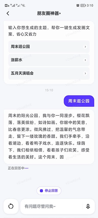 你可以随机生成一个主题,它会帮你一键生成发圈文案,简直省心又省力,比如:周末逛公园~