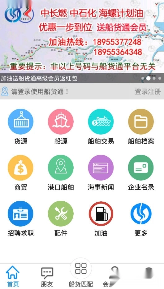 “船货通”数据和长江水运网保持同步,依旧具备注册、登录、会员中心、在线充值以及在线开通会员权限等功能。同时,对货源信息、船源信息、船舶档案、船舶交易、商贸信息、新闻资讯等板块功能进行了重新规划,还新增了朋友圈、即时在线询盘、船舶到港提醒发布、手机定位以及信息推送等功能。