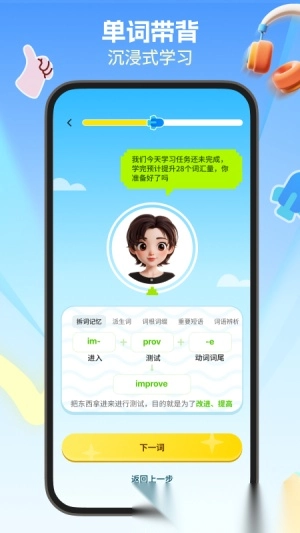 2. App内单词将以卡片形式呈现,并搭配发音、词性、释义等,助力单词记忆。