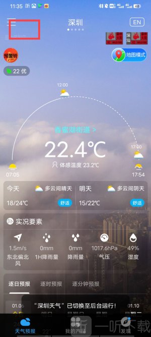 1. 当您进入软件的首页时,便能看到详尽的天气信息,此时请点击左上角的预警铃。