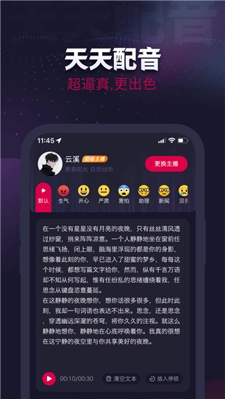 天天配音,一款适配多行业、多场景的配音软件。平台上云集各类热门声音主播,任你挑选。软件还融入方言元素,增添接地气的特色。导出内容格式多样,为你打造更便捷的操作体验。