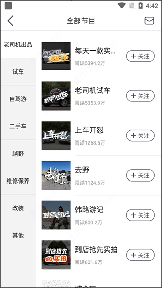 2、平台还提供了多种类型的汽车视频节目,随时可以关注并浏览。