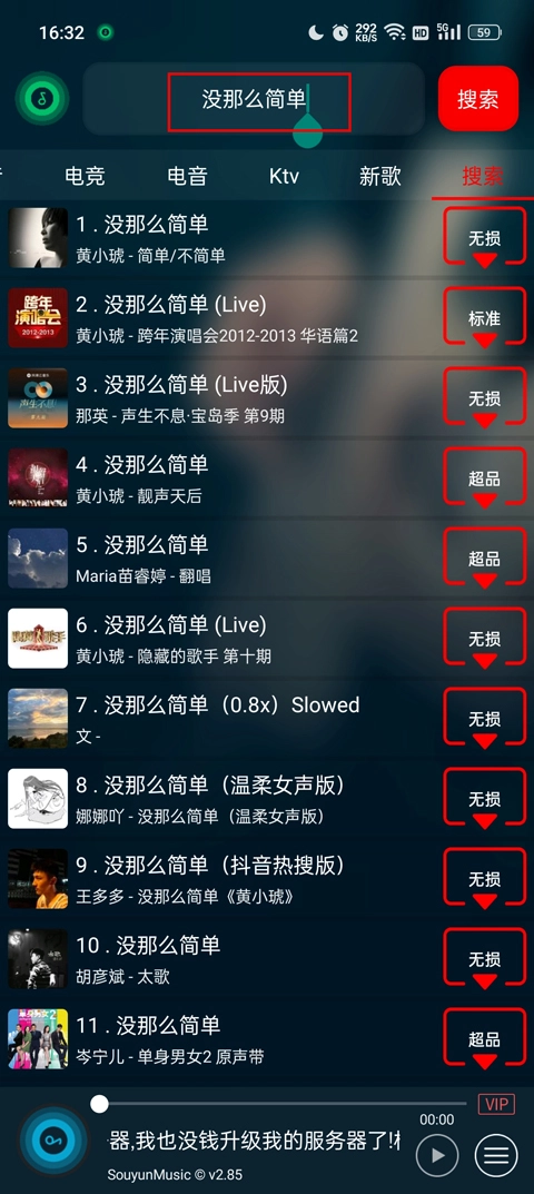 3、搜索到之后,点击这首音乐右边的无损按钮;