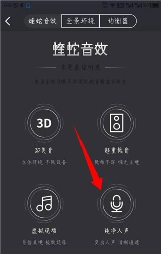 4、接下来,你会看到顶部出现菜单选项,其中可选择蝰蛇音效全景环绕以及均衡器,具体如以下图示。