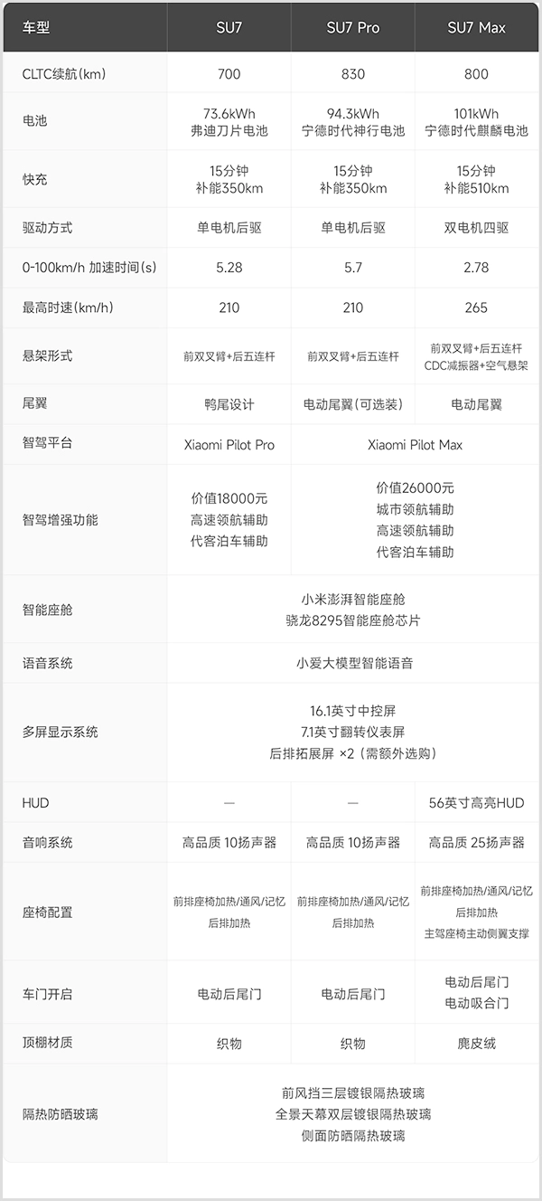 SU7版本核心参数参考下图