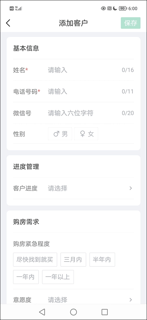 3、接下来,在“添加客户”界面完整填写客户基本信息与带看信息,随后选中并点击右上角的“保存”选项,如此便完成了报备客户的操作。
