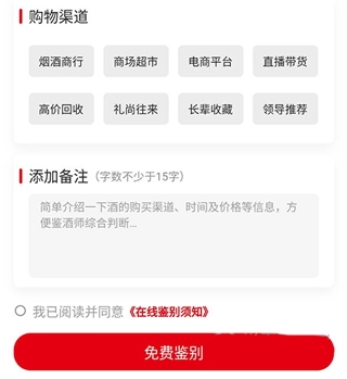 4、接下来挑选购买渠道,补充相关备注,点击免费鉴别选项,随后便可等待鉴酒师开展鉴定工作。