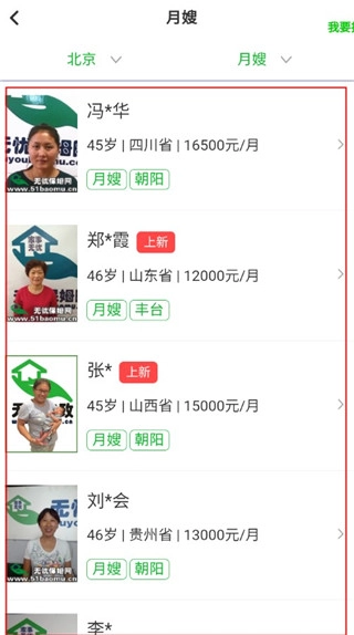 2、接下来,系统便会向你推荐形形色色的保姆,你可以点击进入,查看保姆的相关信息。