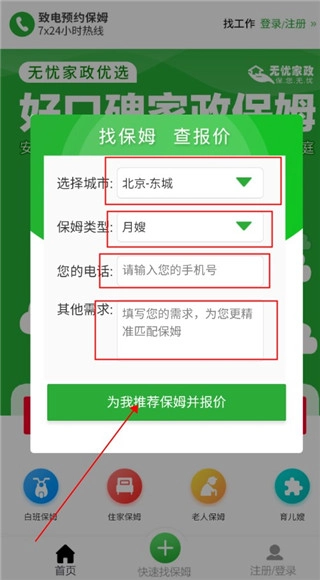 5、填入您的地址及相关信息,明确所需保姆的类型,随后系统将为您推荐符合要求的人选。